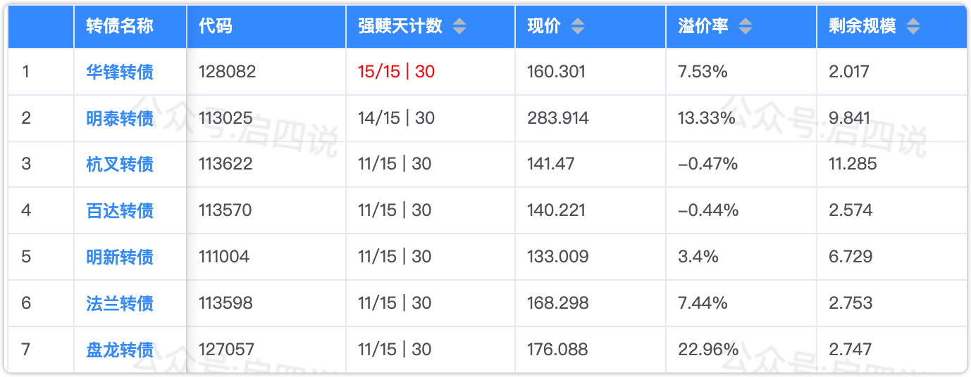 下面这些转债,要注意强赎杀溢价风险,尤其是溢价率在5%以上的。