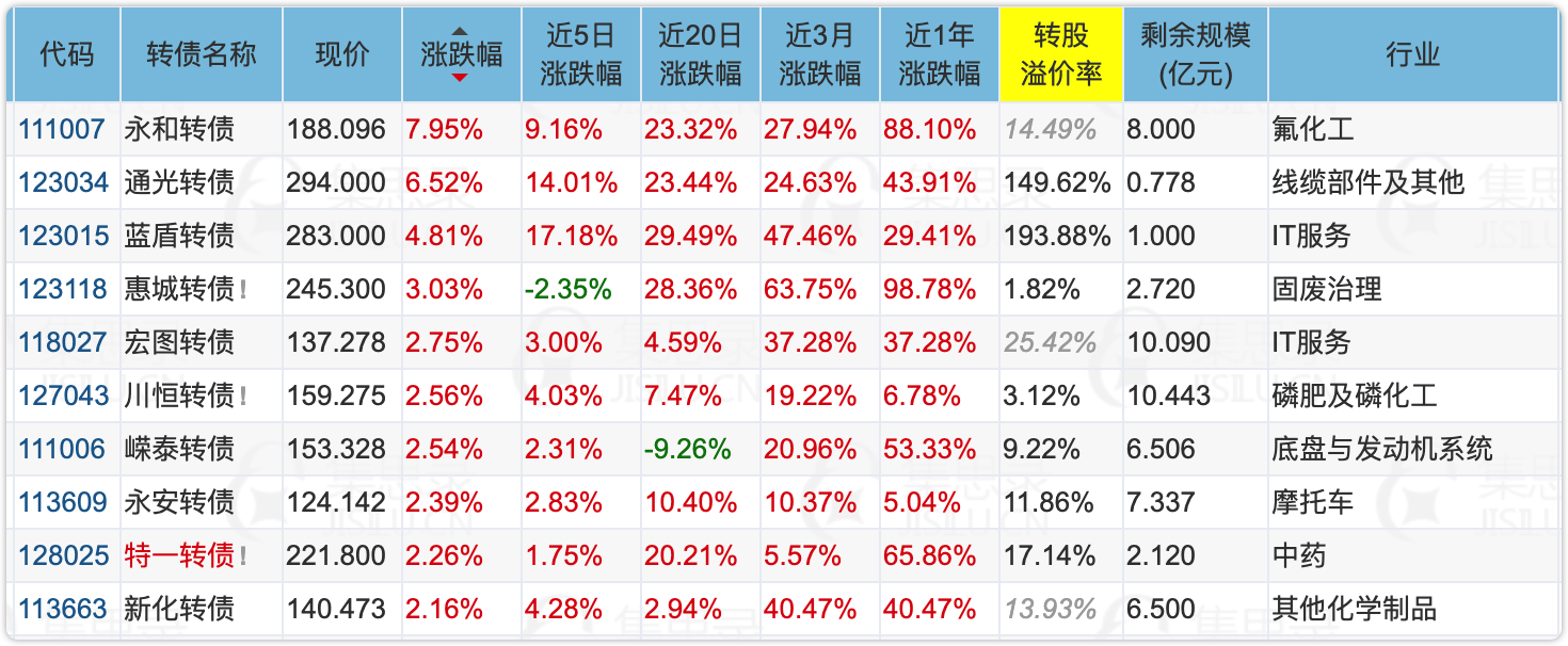 大盘不好的时候,妖债就容易活跃,另外我国二代制冷剂逐步削减,制冷剂R22价格上涨,因此唯一拥有氟化工概念的永和转债大涨。