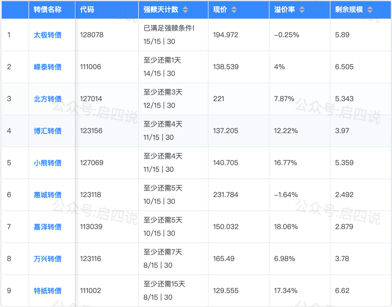 下面这些转债,要注意强赎杀溢价风险,尤其是溢价率在5%以上的。