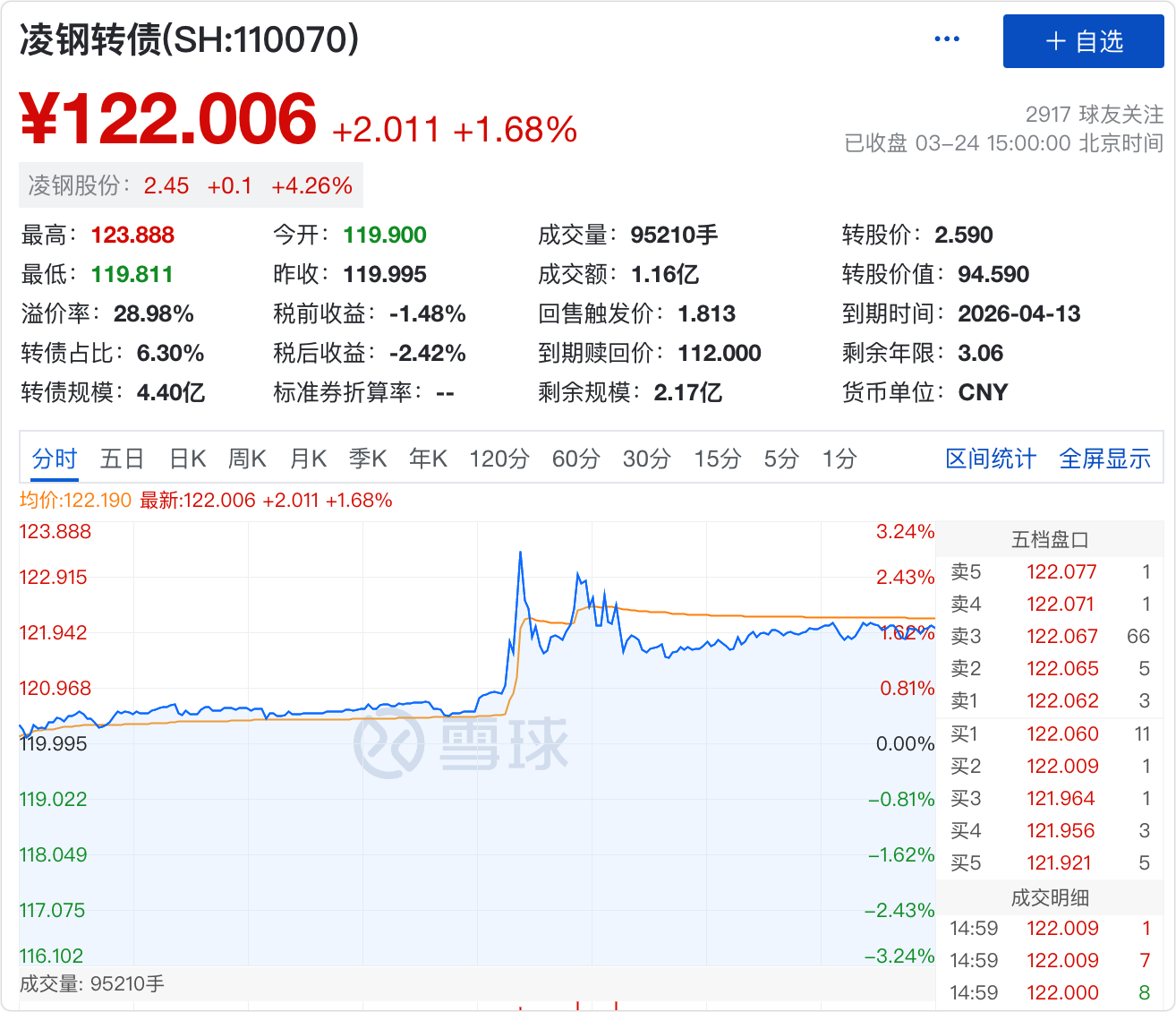 2、凌钢转债,今天盘中异动,正股凌钢股份最高涨幅7.2%,目前日K线重新回到五线之上(5、10、20、60、120日价格平均线),有句话叫重上五线金不换,经济复苏周期中,钢铁、煤炭、有色金属、化工等顺周期品种容易走强,正股有望继续拉升,隐隐感觉凌钢转债起飞就在下周。(瞎猜的,非投资建议)