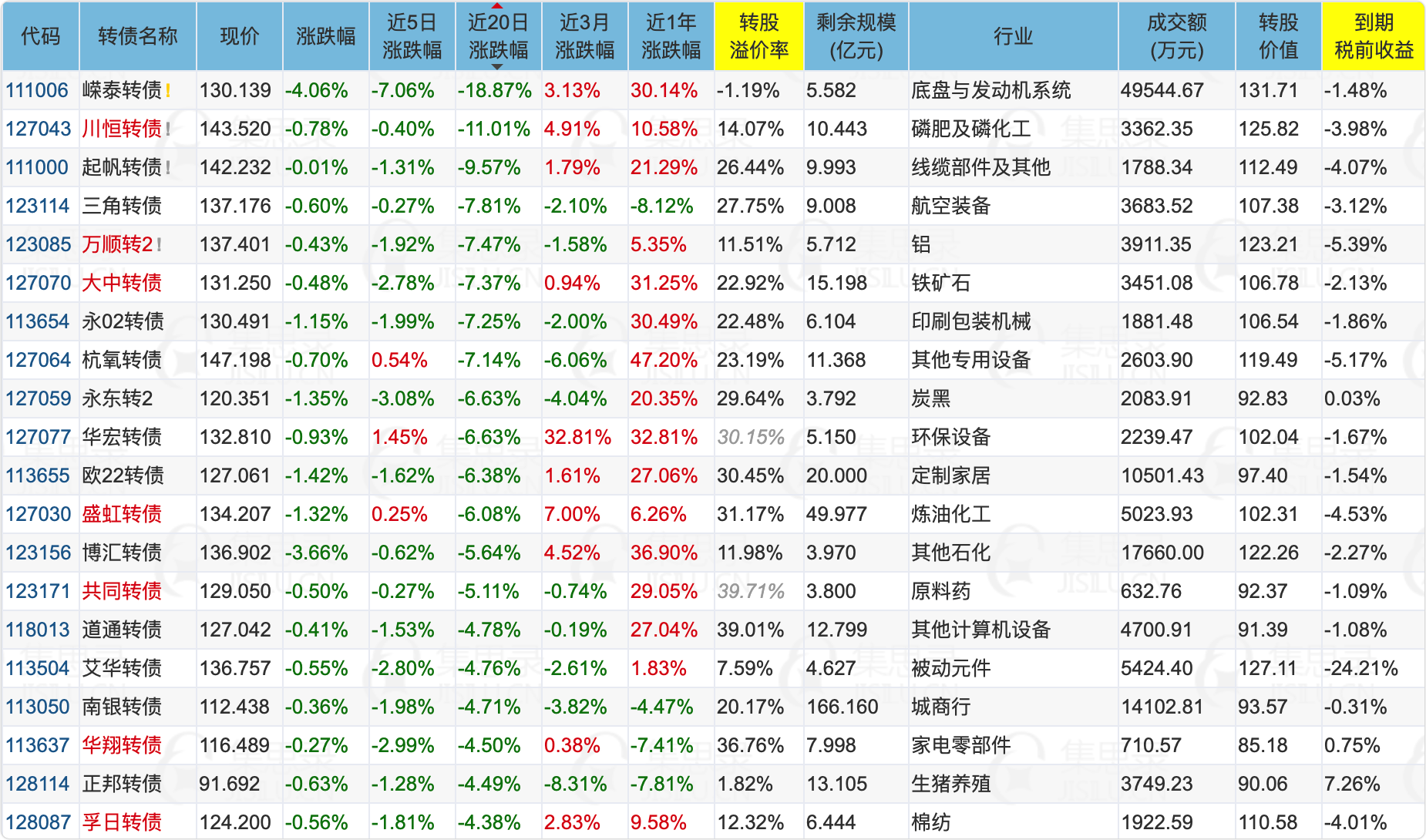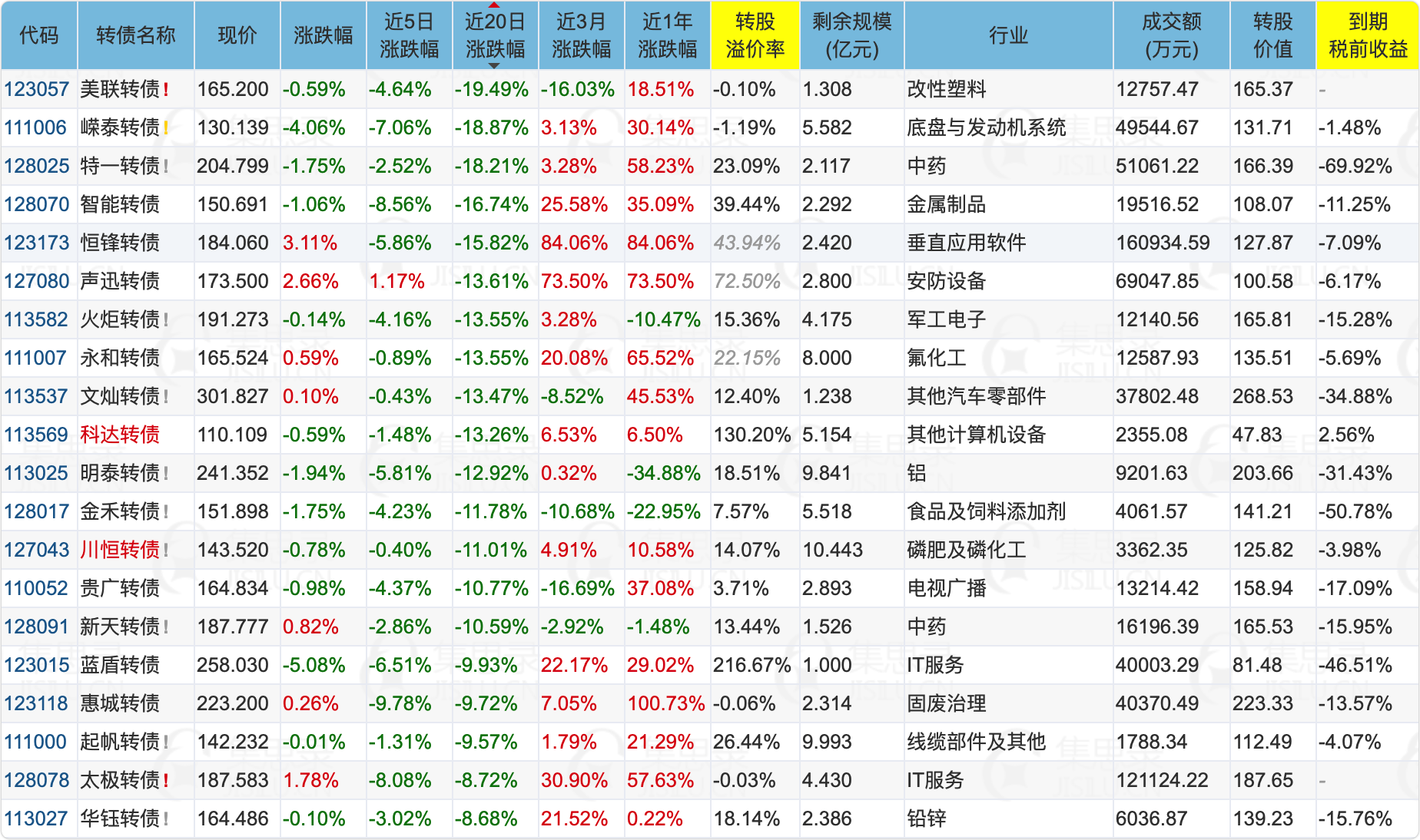 1)150元以下,溢价率小于40%的转债中,近20日跌幅最大的前20名转债: