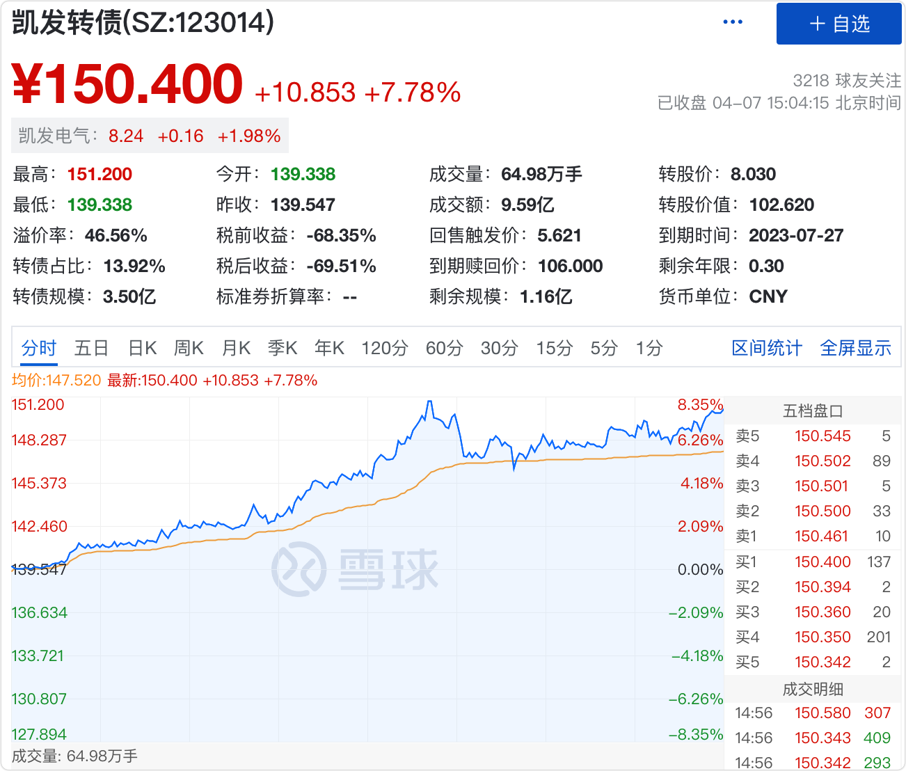 今天凯发又突破了150元,我选择了盈利出手清仓。