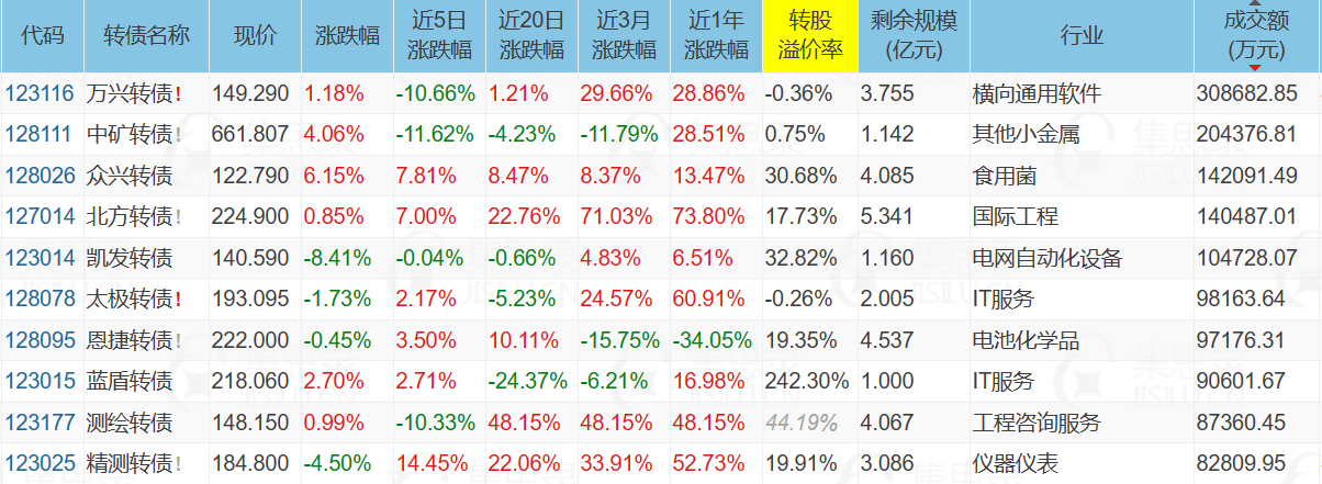可转债等权指数,今天涨幅度-0.38%,中位数123.781元,位于二星级估值区,成交额421.09亿。