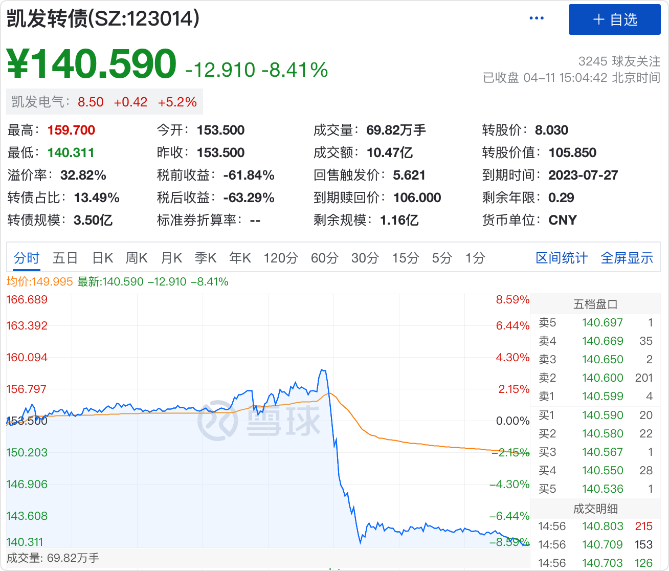 2、凯发转债,我在上周五清仓了,今天正股上涨5.2%,转债反而下跌了8.41%,下午一点半左右凯发突然遭遇了断头杀。盘中最高价159.7,收盘价140.59。数字不直观,直接看图: