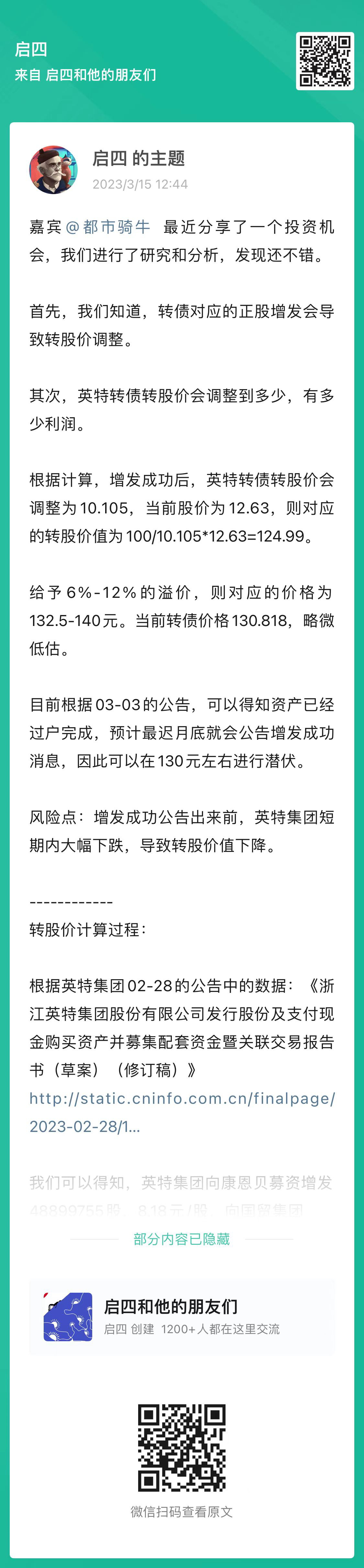1、英特转债,前段时间进行了两次增发,增发成功后会导致转股价变化,经过计算后可以发现有利可图。目前英特转债已经发出了公告,将修改转股价为10.11(我的计算是10.105,基本无误差),明天正式生效,这样根据当前股价,可以得出转股价值会提升到122+,保守给8%-12%的溢价,合理价值应该在132-137元。