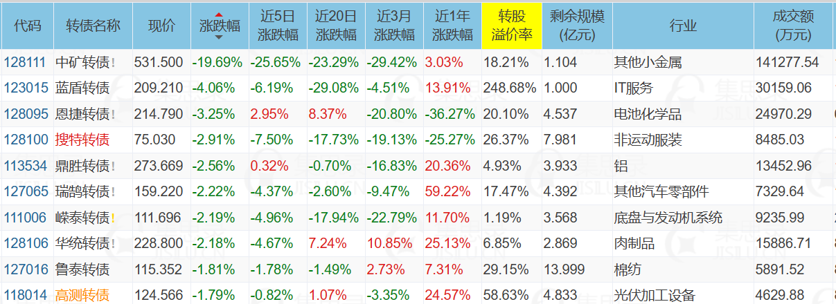 2、中矿转债,今天暴跌19%,因为正股中矿资源,低价增发股份,导致转股价由原来的11.01元/股调整为15.88元/股,转股价被动上调了30%,目前转股价值450,给10%溢价,合理价格在500元左右,当前溢价18%还是略高了。