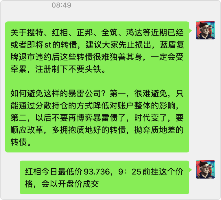 早上我在社群提示了暴雷债风险,如果在开盘前及时止损,都能避免更多的损失。