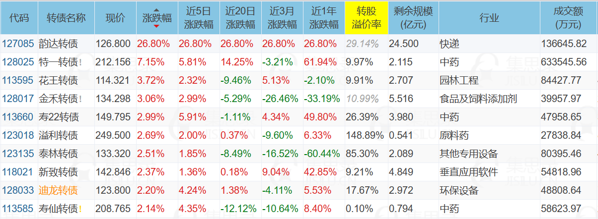 转债方面,中药板块领涨 ,强赎债、次新债、半导体领跌。