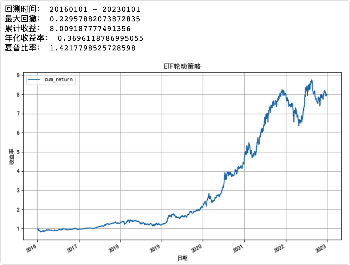 最近转债这边行情比较寡淡,我开始研究ETF轮动策略,目前有了一点小成果,采用宽基轮动策略,回测时间2016-01-01到2023-01-01,最大回撤22.96%,累计收益800%,年化收益率36.96%,夏普比1.42,7年8倍,还是非常不错的。