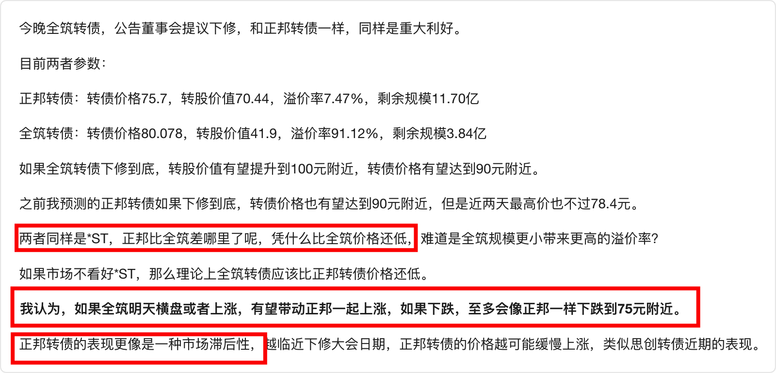 不过我还是认为越临近下修大会,正邦和全筑上涨的可能性越大,因为每过一天,风险就降低一分,时间对他们有利,类似思创近期的表现。