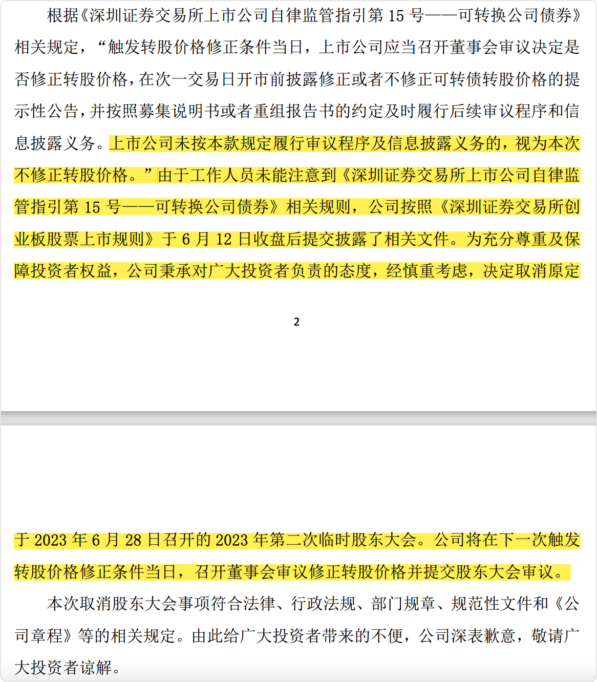 公告中说由于自己工作人员未能注意到相关规则,因此下修公告发晚了,现在取消下修下次再议,并敬请广大投资者谅解。