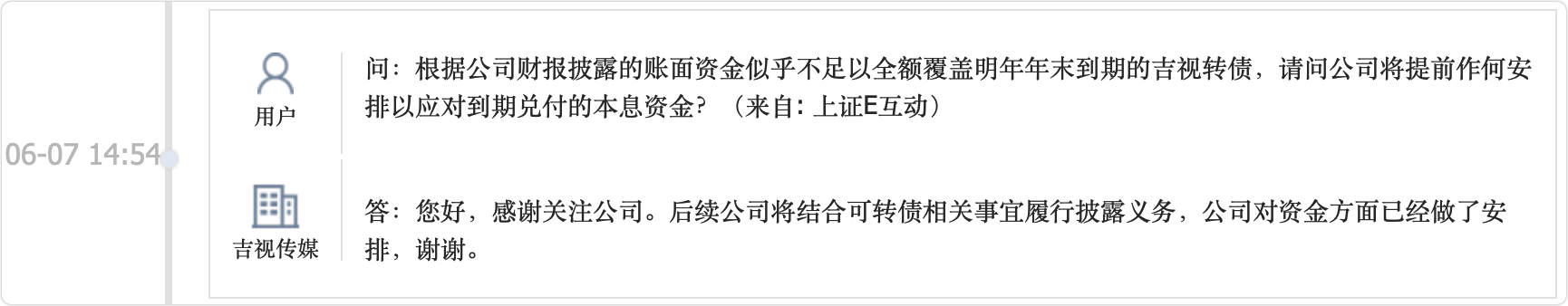 这三条路,启四经过分析后认为第二条路是吉视转债最可能走的路。参照06-07投资者互动中的回复,董秘称公司对资金方面已经做了安排。