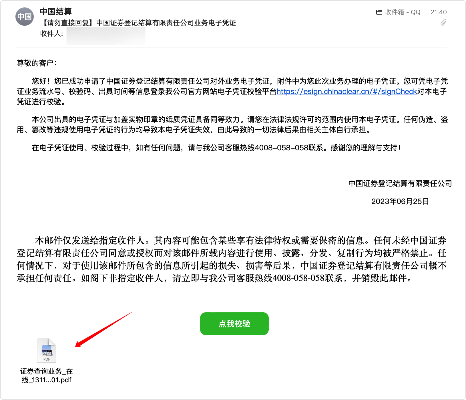 最后,邮箱可以收到中国结算发来的持仓证明邮件。