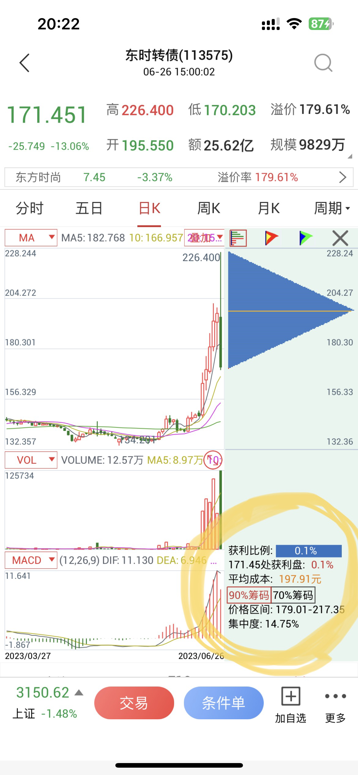 东时转债是之前轮动策略中吃到的肉,在165元左右就放手了,节前一路飙涨到最高200元,今天最高达到了226.4元,随后以“飞流直下三千尺”的气势一路暴跌到170元附近。里外里差价居然达到了56元。