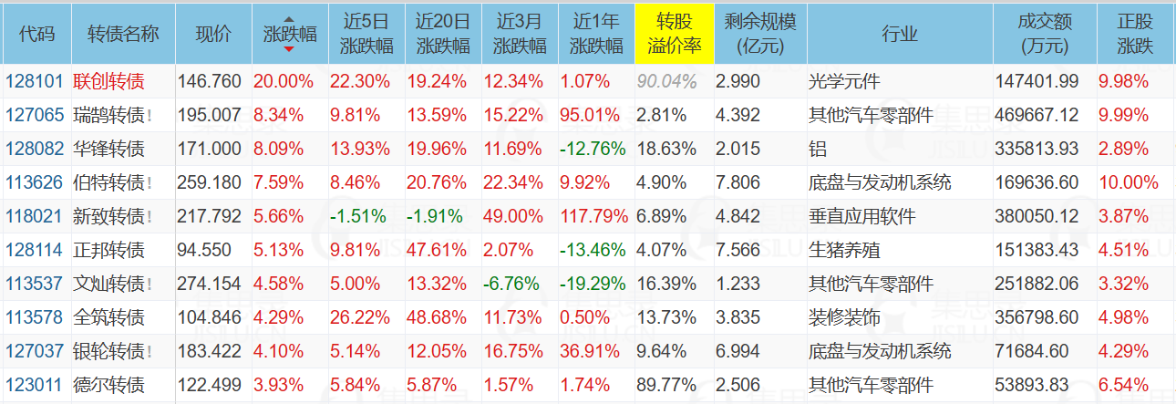 联创转债正股涨停,转债20%涨幅。