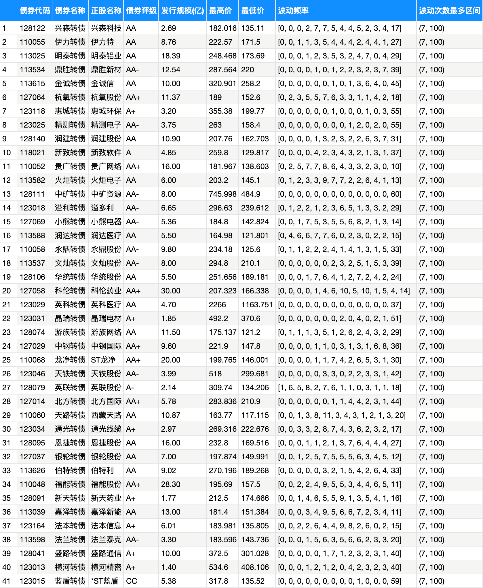 近期在研究网格策略,今天统计了近60交易日转债的成交情况,分析了每天最高价和最低价的波动范围,发现了41只转债波动区间在7元以上的次数最多,也就意味着如果做网格的话,每成交1次利润将会非常可观。