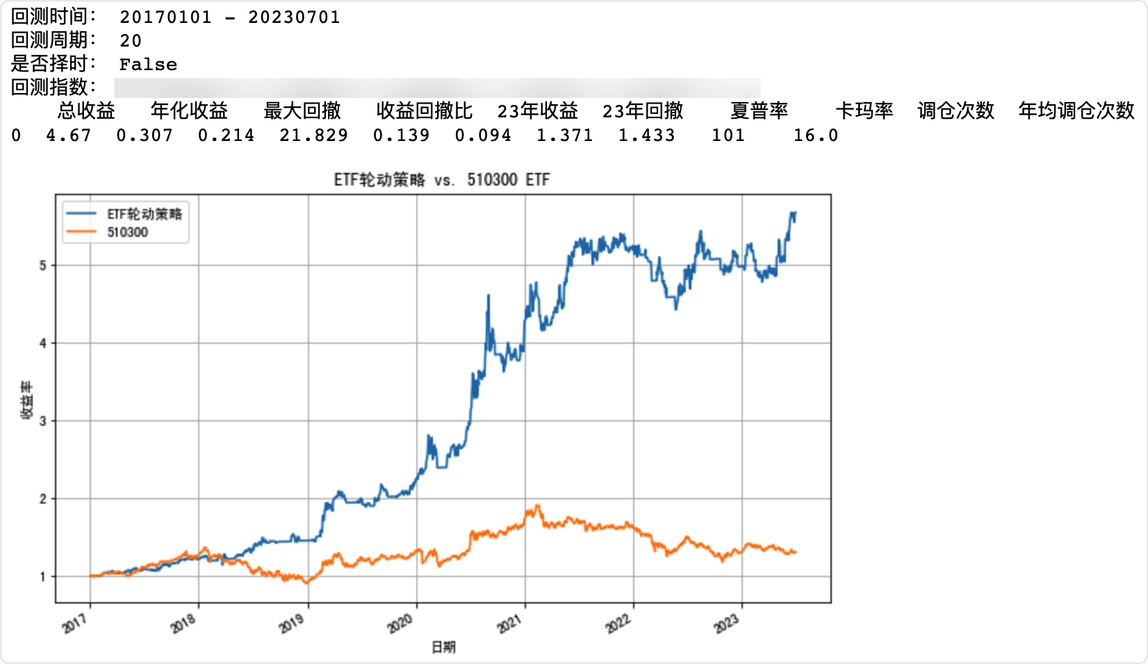 ETF主要用的是动量思维,回测时间:2017-01-01到2023-07-01,回测年化收益30.7%,最大回撤21.4%,目前跑了一个月,社群内部都挺满意的。