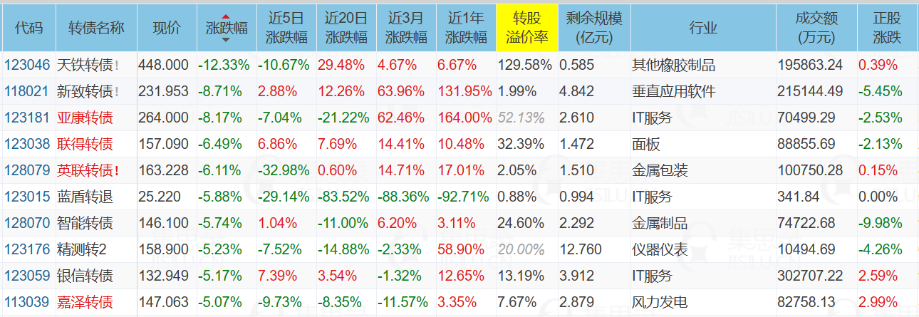 其中天铁转债、亚康转债是双高妖债杀溢价,