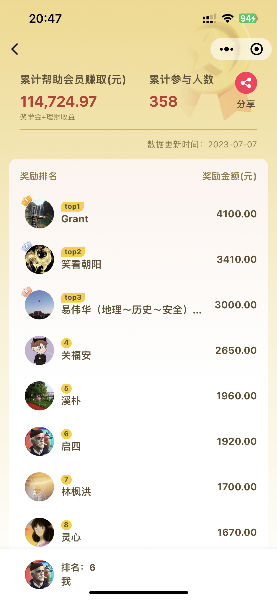 给大家同步一下目前数据(截止7月19日),累计发放奖金:114724.97,最高领到奖金:4100元,其中领到500元以上57人。