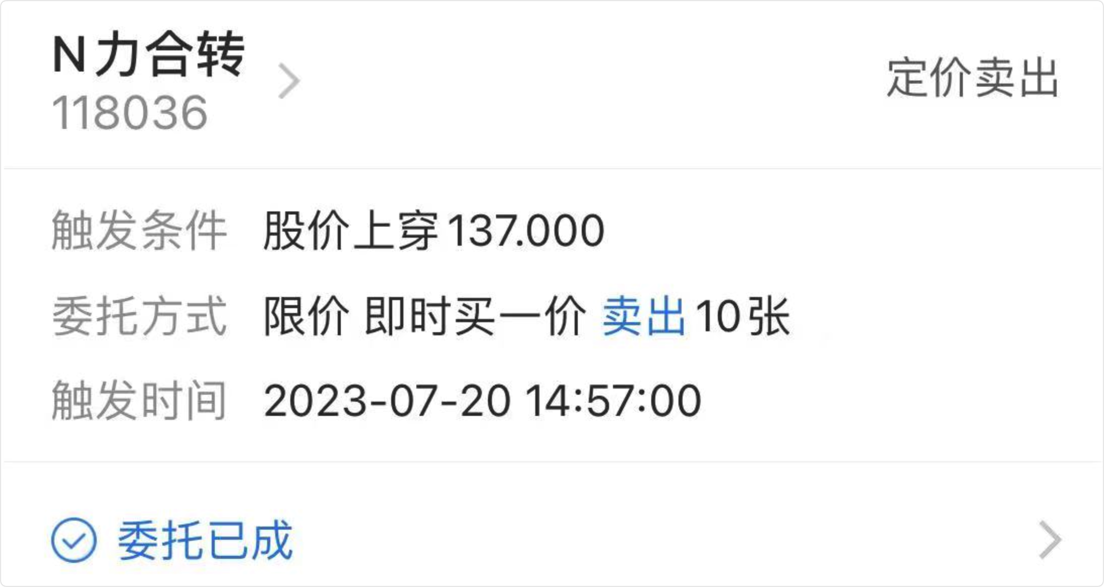 比如下图的力合转债,上市首日设置定价卖出条件单(东方财富的),股价上穿137元,即时买一价卖出,最终在14:57触发,157.3元成交卖出。