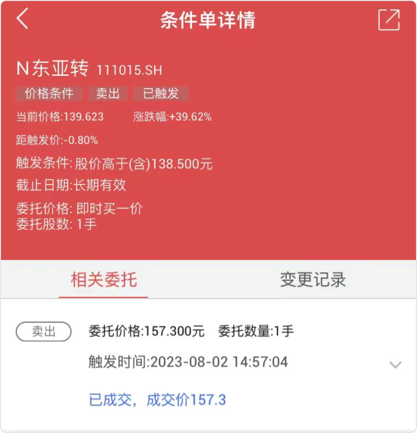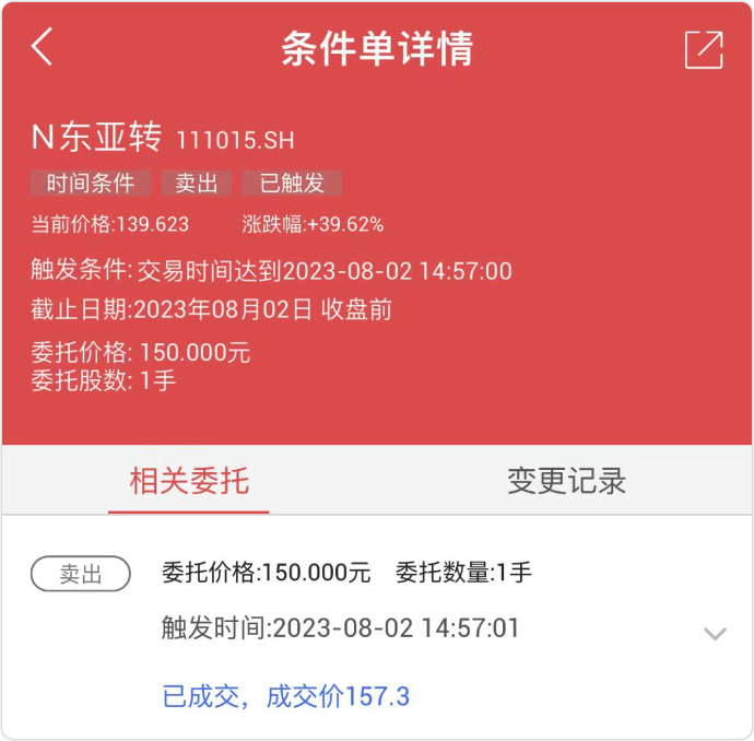 比如下图的东亚转债,上市首日设置时间条件单,14:57,委托150元卖出,最终14:57:01触发,157.3元成交卖出。(这里其实使用限价委托更好一些,万一价格只能冲到143元,委托150元就触发不了)