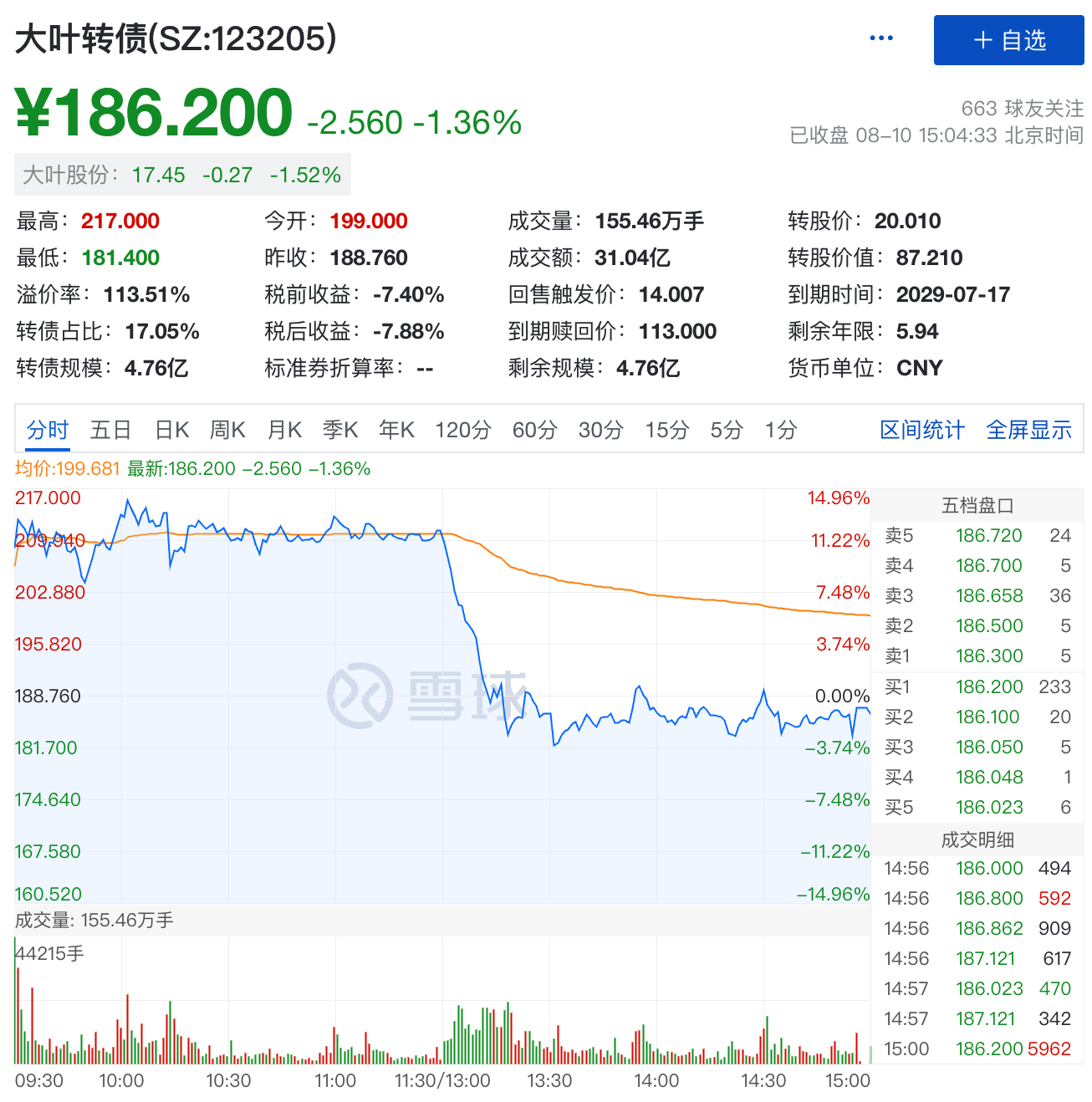 大叶转债正股质地一般,流通规模1.63亿并不比开能转债的1.48亿小,却受到了游资青睐,盘中最高冲到了217元,但是午后开始跳水,收盘186.2元,最低价181.4元,上下差价最高达到了35.6元。