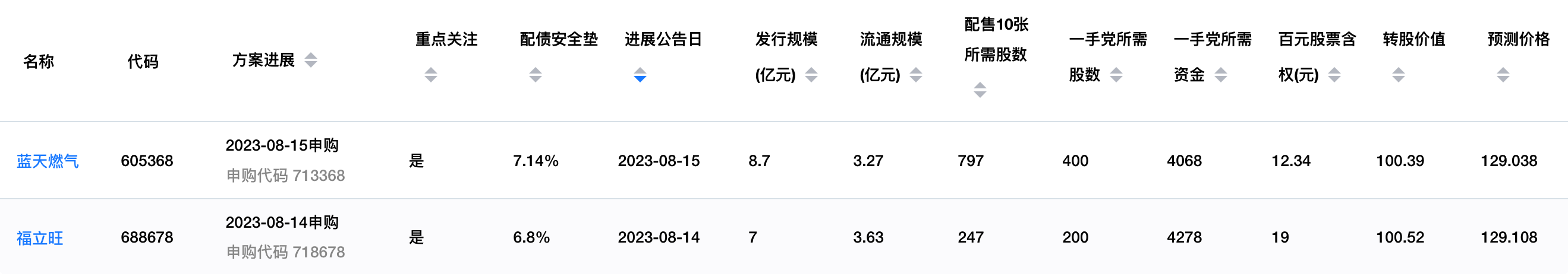 蓝天转债,2023-08-15申购,配债安全垫7.14%。
