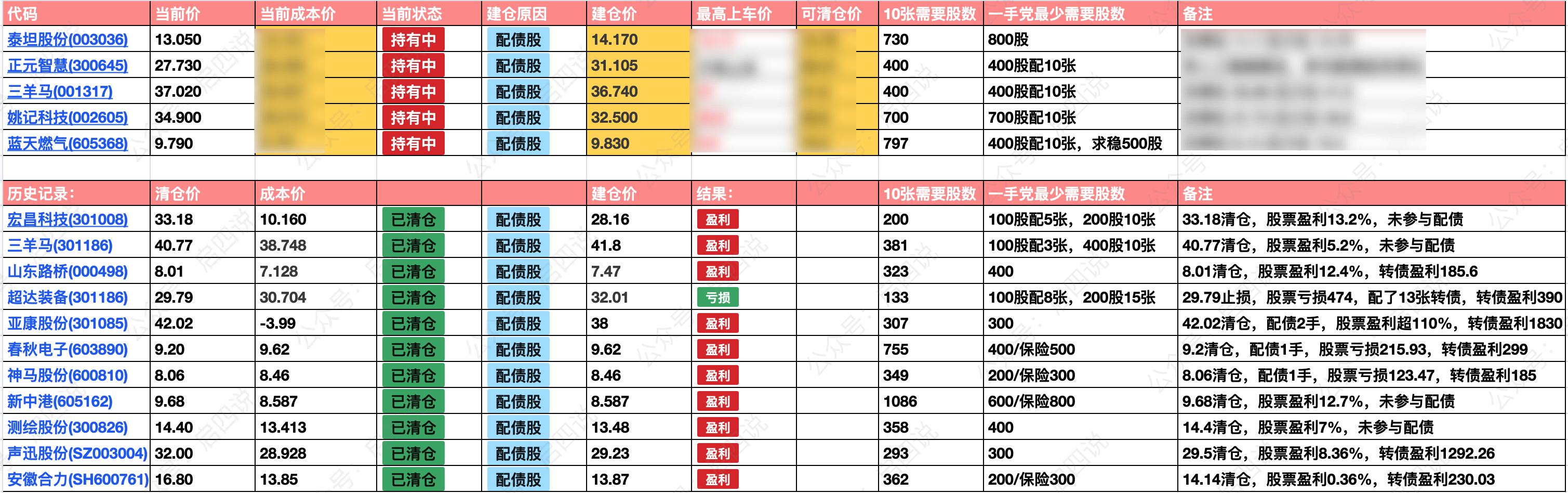 今年一共参与了16只配债股,目前持有5只,已经清仓的11只配债股中10只盈利。