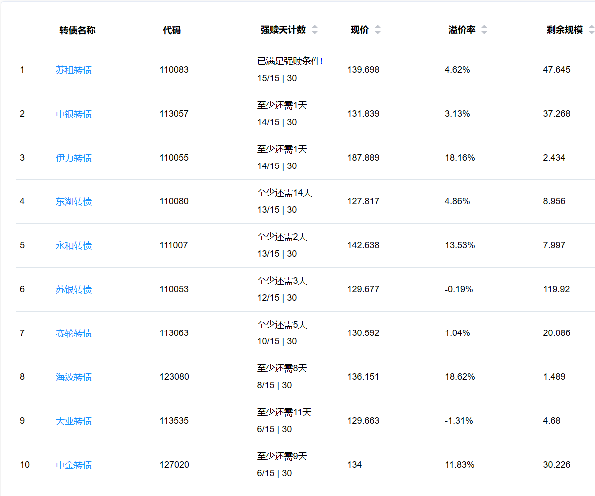 下面这些转债,要注意强赎杀溢价风险,尤其是溢价率在5%以上的。
