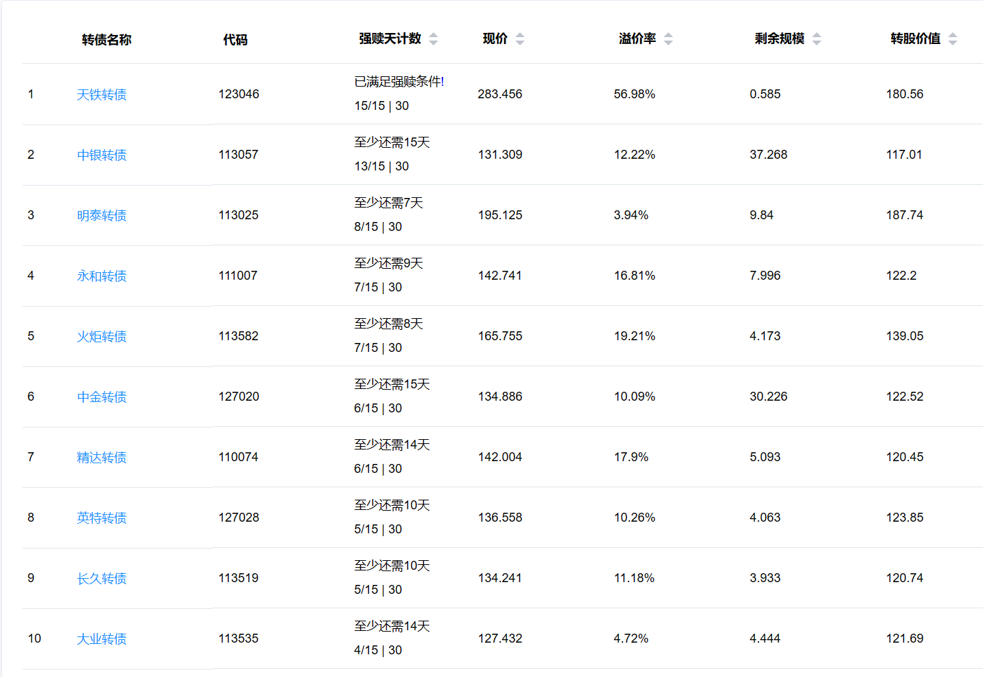 下面这些转债,要注意强赎杀溢价风险,尤其是溢价率在5%以上的。