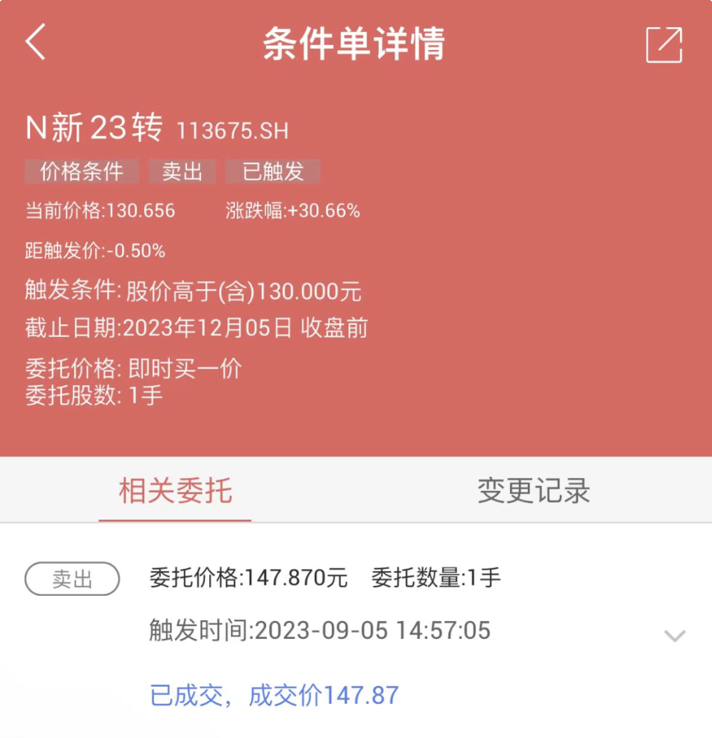 今天的新23转债,不知道是哪个大冤种居然将价格拉到了157.3元,如果按照昨晚文章中的操作建议设置条件单,可以卖在147.87元,相比收盘价130.656元,一手能多赚172元,相当舒服。