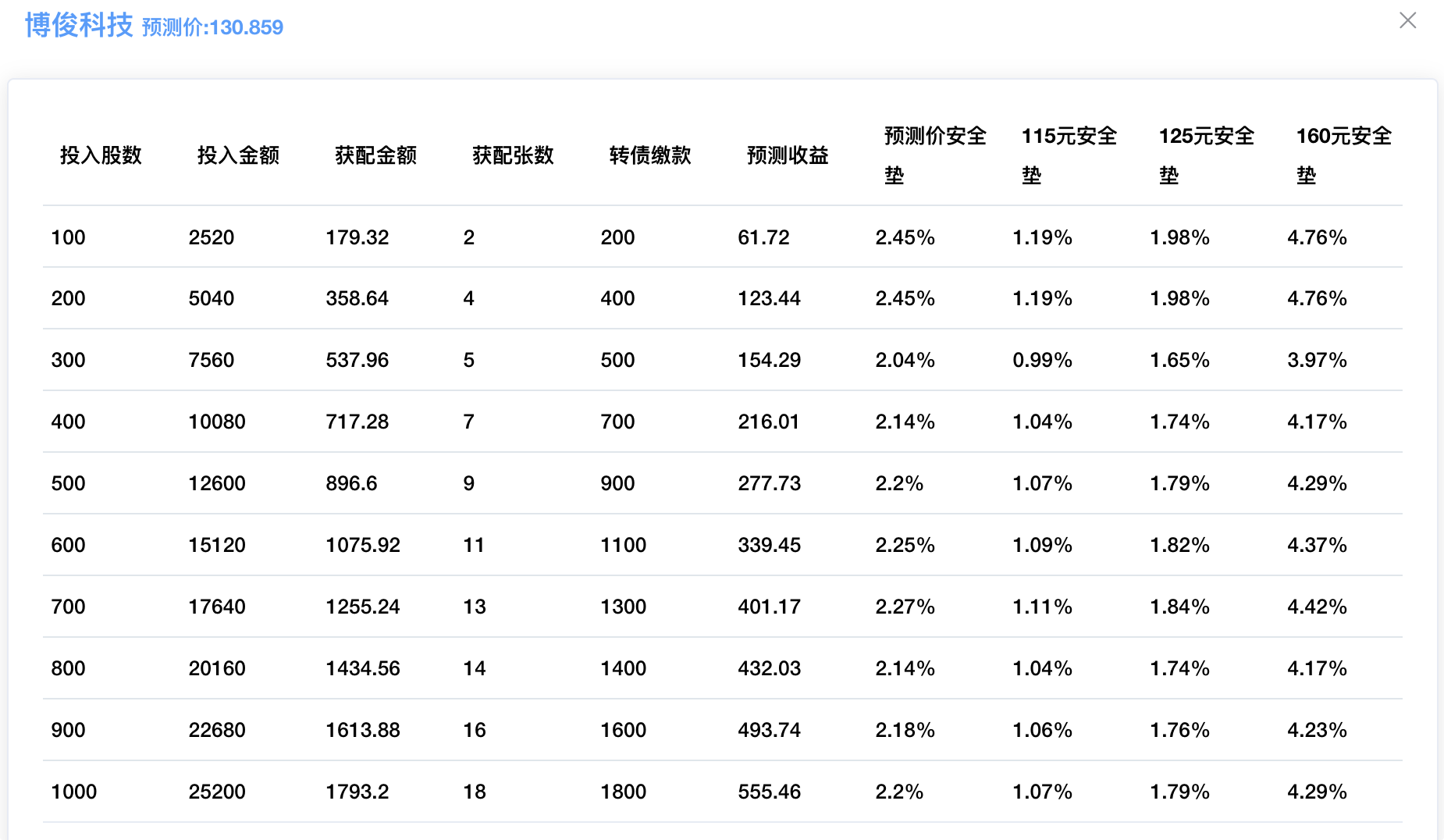 考虑到博俊转债流通规模只有1.44亿,且正股是近期热门的汽车零部件行业,转债上市后有望涨上200元,如果按照200元来计算的话,投入600股配11张的安全垫为7.28%。