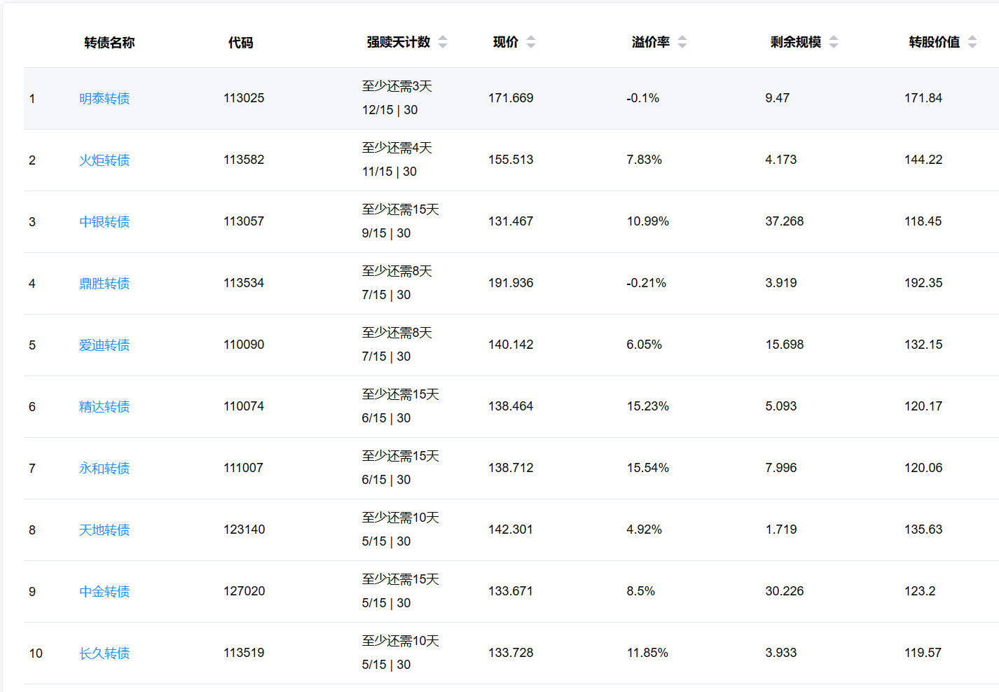 以下是近期即将开始重新强赎计数的转债,要关注溢价高于5%的转债强赎风险。
