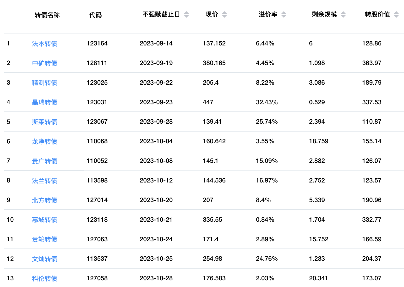 风险当前尤其大的是新港转债,因为三天后9月14日,它就进入转股期了,进入转股期后,大股东的持债份额解禁,它的流通规模将会从不足1亿升高为发行规模3.691亿 ,比它规模更小的还有113只转债,这些转债的平均溢价率为55.32%,3亿规模以上的转债平均溢价率45.59%,新港转债当前72.28%的溢价率,明显是高估的,至少还有15%的杀溢价空间。