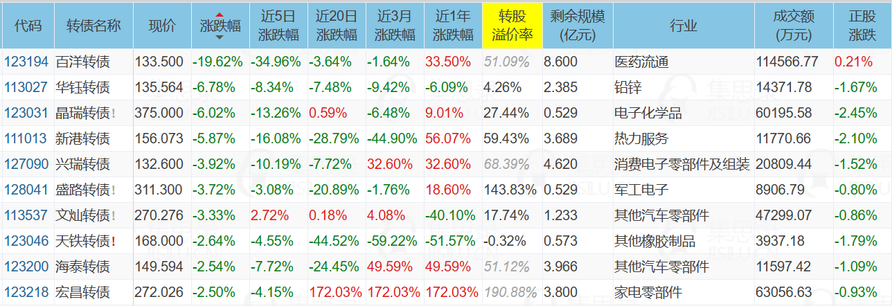 2、华钰转债,今日跌幅6.78%,原因是还有4天就要满足强赎条件了,市场提前杀溢价,当前价格:135.564元,溢价率:4.26%,剩余规模2.384亿,剩余年限1.734年。