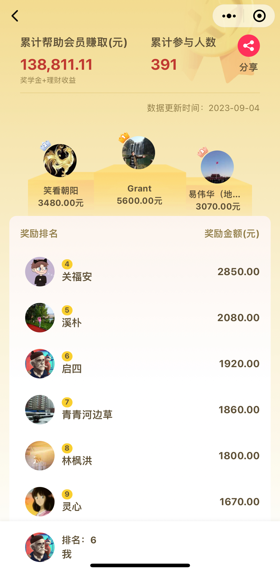给大家同步一下目前数据(截止9月21日),累计发放奖金:138811.11元,最高领到奖金:5600元,其中领到500元以上的有81人。