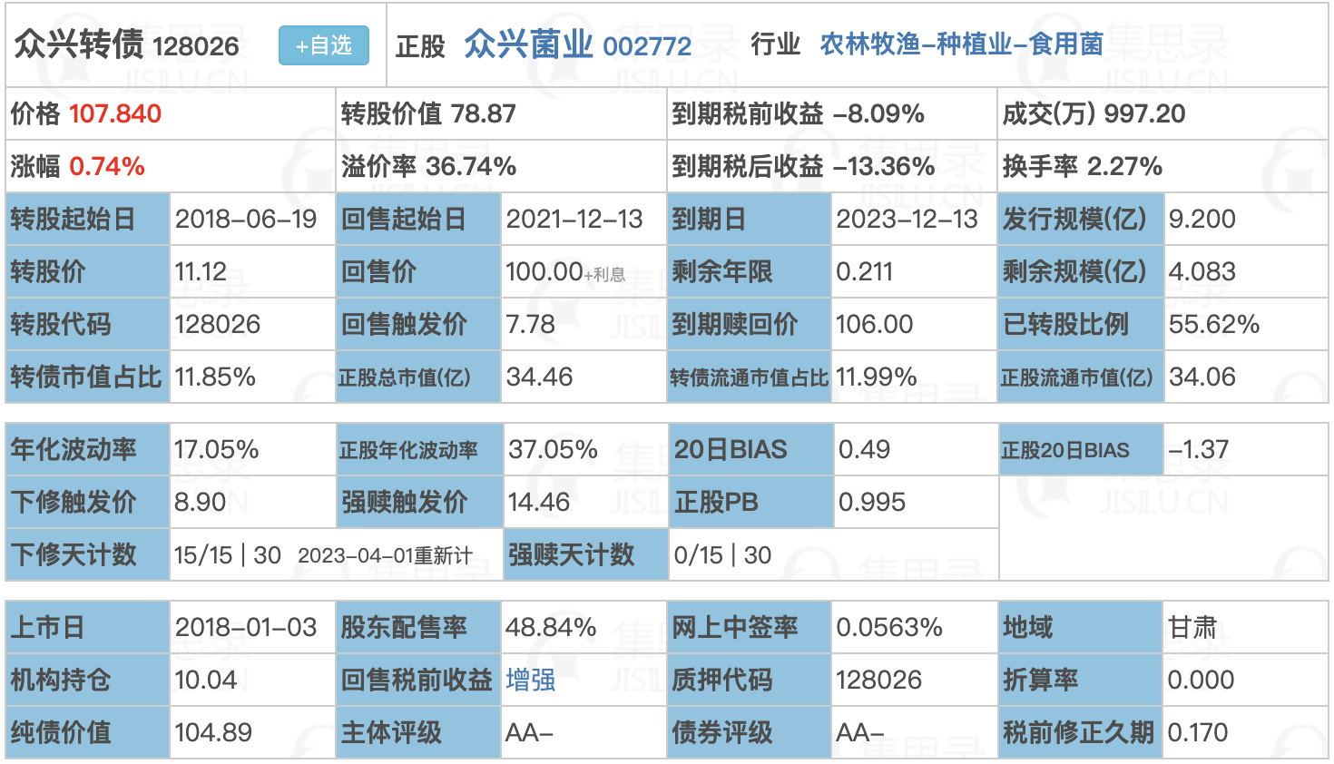 目前转债价格107.84元,转股价值78.87元,溢价率36.74%,剩余规模4.083亿,剩余年限0.211年。