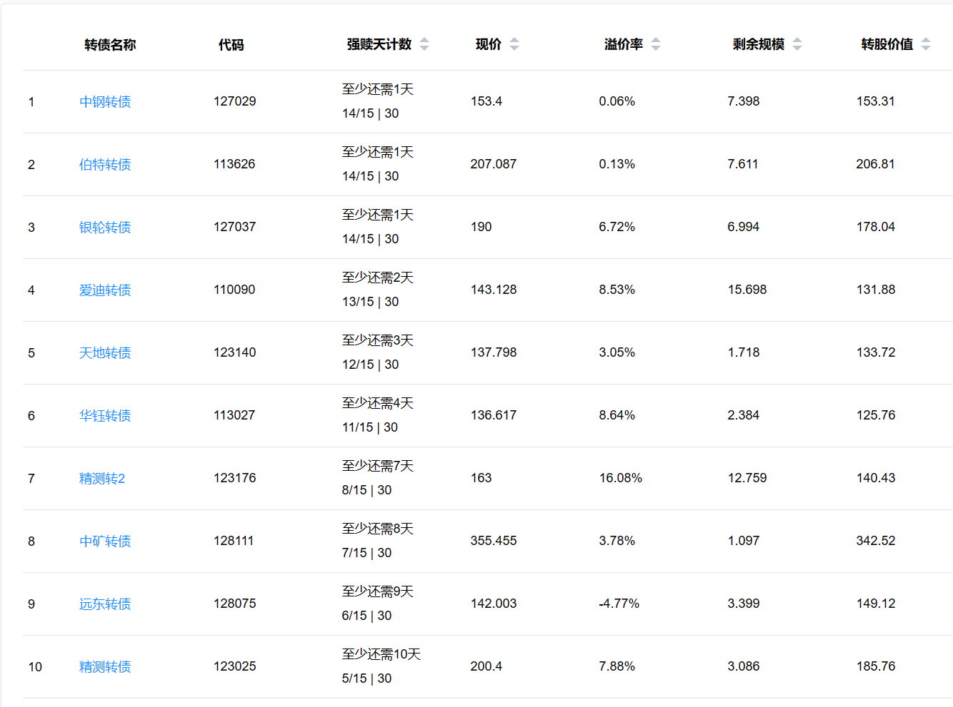 天地转债,当前价格137.798,溢价率3.05%,剩余规模1.718亿,未来12个交易日中有3个交易日转股价值在130元以上,就能满足强赎条件。