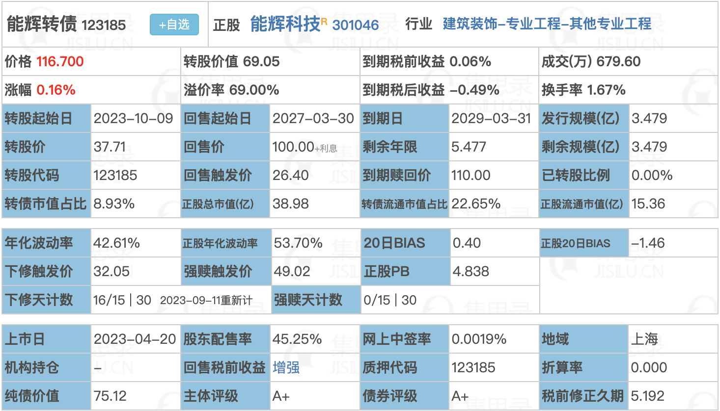 4、能辉转债,提议下修,无主动下修记录。目前转债价格116.7元,转股价值69.05元,溢价率69%,剩余规模3.479亿,剩余年限5.477年。