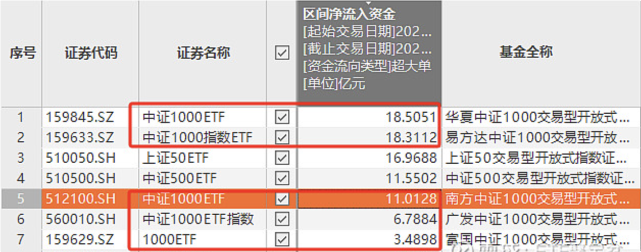 choice数据显示,10月份以来,资金净流入前7只ETF产品里有5只是中证1000ETF,分别是:华夏中证1000、易方达中证1000、南方中证1000、广发中证1000、富国中证1000。