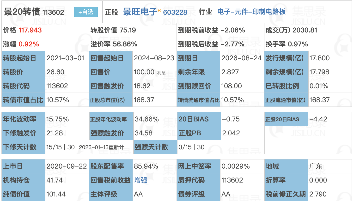 景20转债的募集说明书规定下修不受公司净资产限制,以正股现价和20日均价预估下修到底后转股价值为95-97元,给予27%的溢价率,预估合理价值120.6-123元。
