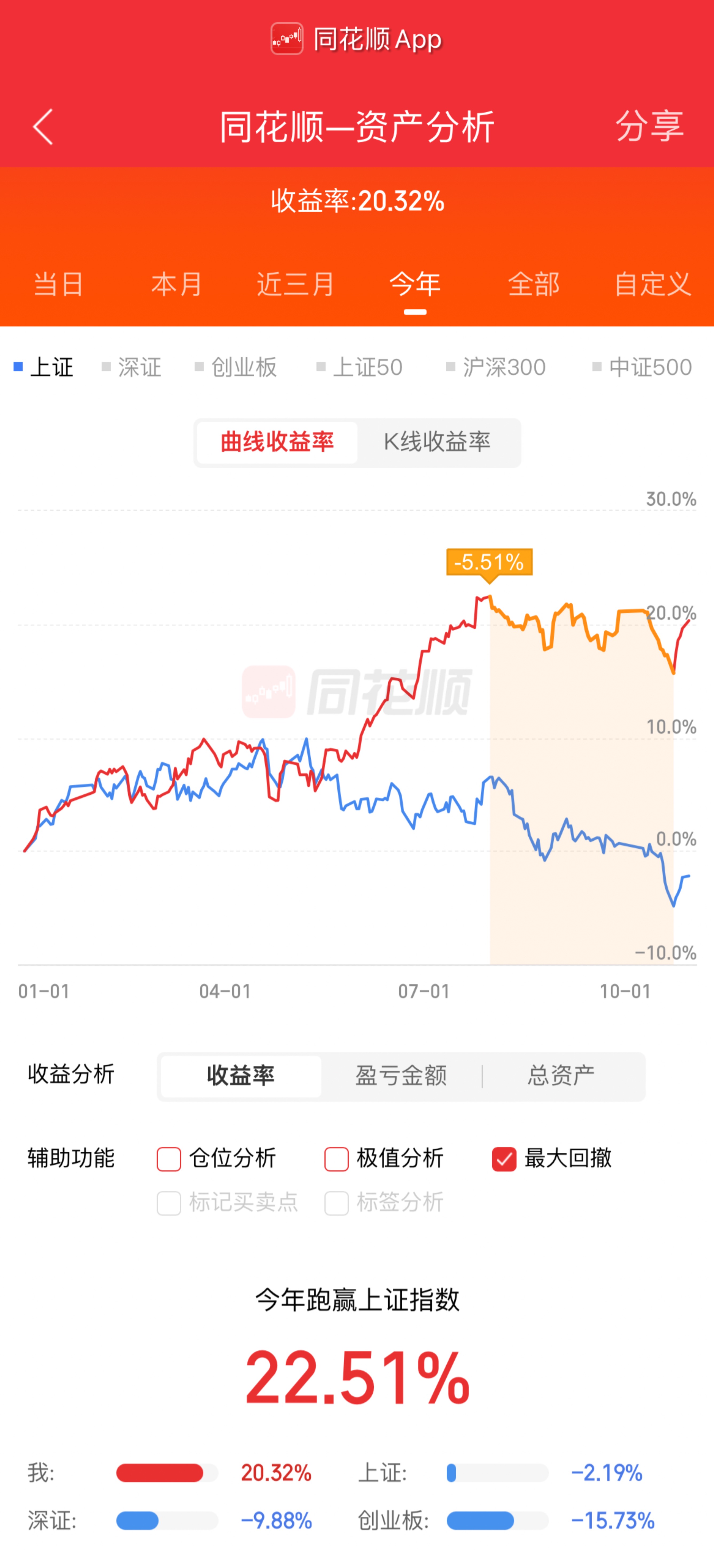 连续回血5天,转债轮动策略收益重回20%+,今年最高收益22.44%,最大回撤5.51%,同花顺投资账本显示这个收益可以击败88%的投资者。