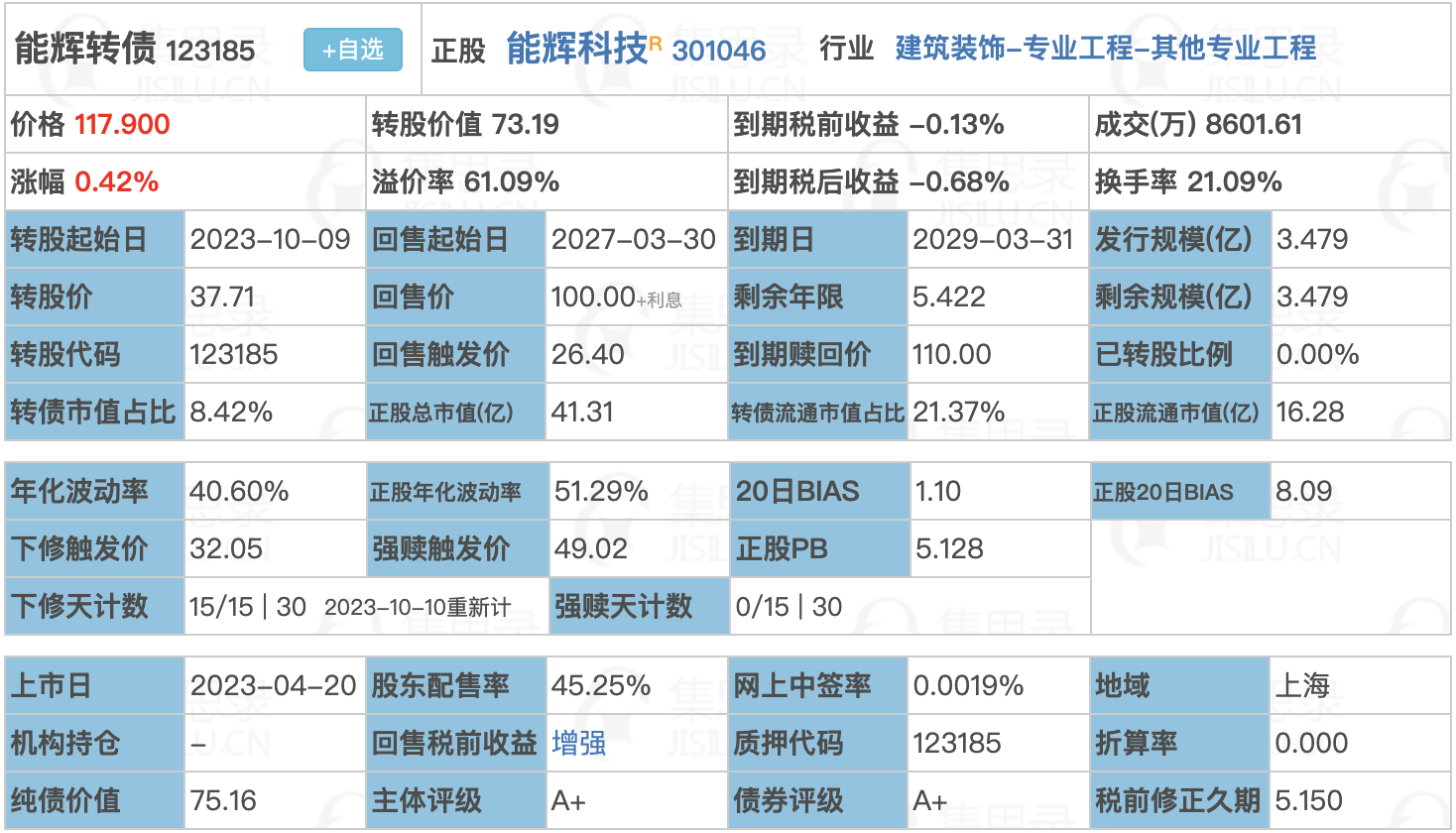 上次由于公告时间太迟,提议下修无效,今天能辉转债再次提议下修,之前无主动下修记录。目前参数如下图: