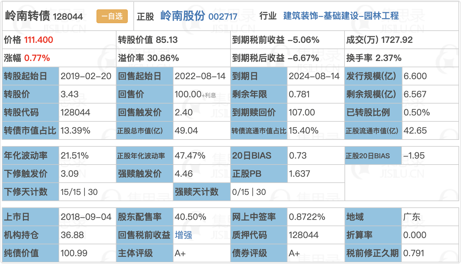 优点是当前价格距离到期赎回价107元下杀空间不算太大,而且正股很喜欢蹭概念控制拉升股价,缺点是剩余年限不足1年,当前的市场情况下临期债不如狗,溢价被压缩的厉害,参考同样下修的临期债博世转债,预估岭南转债公告下修后合理价值在111-113元。