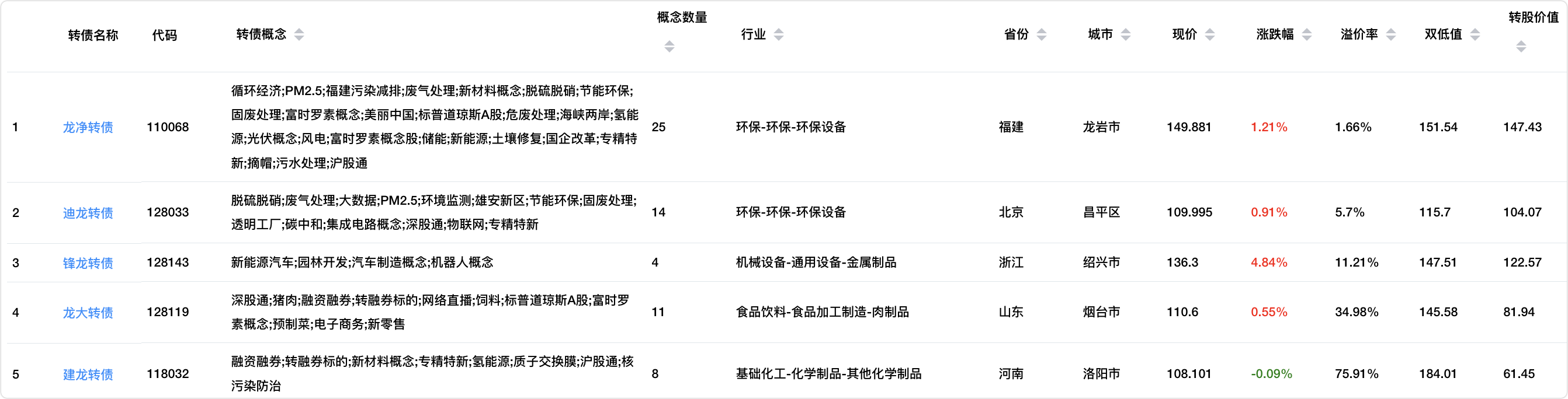 龙净转债、迪龙转债、锋龙转债、龙大转债、建龙转债。