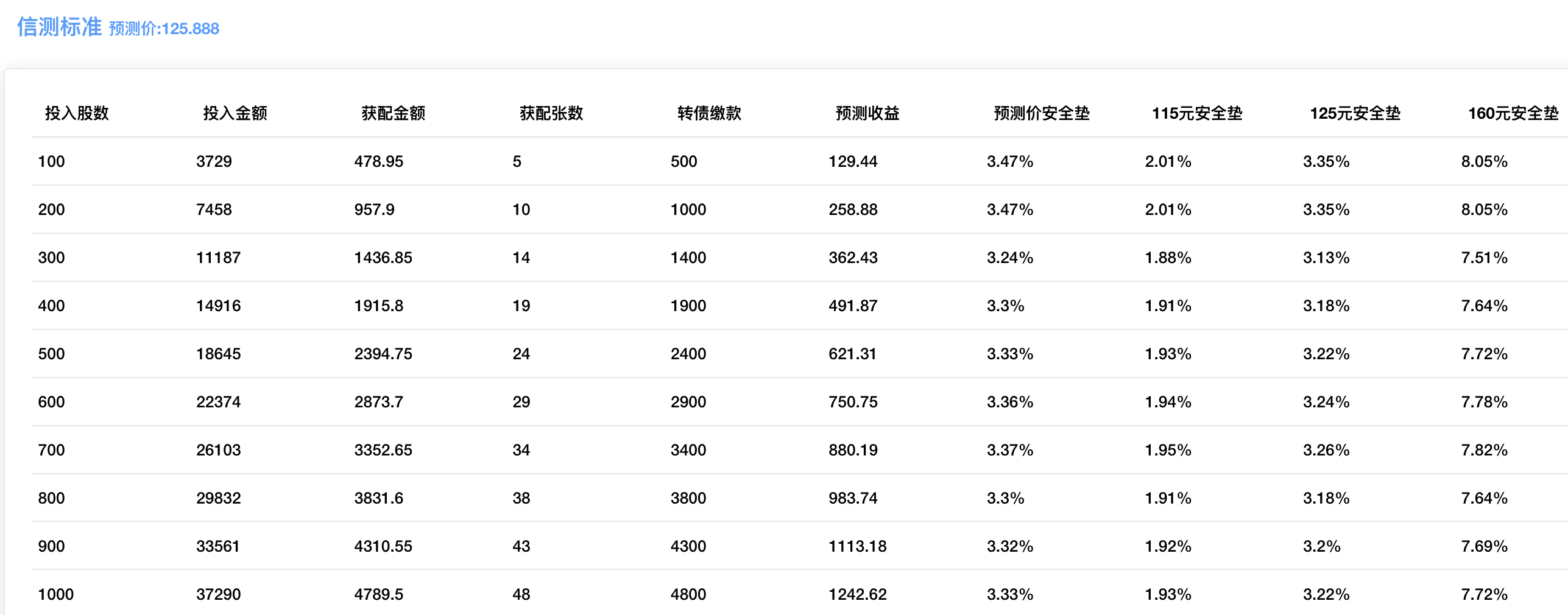 配债所需股数和配债安全垫可以参考下图,上市价格预测在125元左右,安全垫3.3%左右,配债安全垫一般。