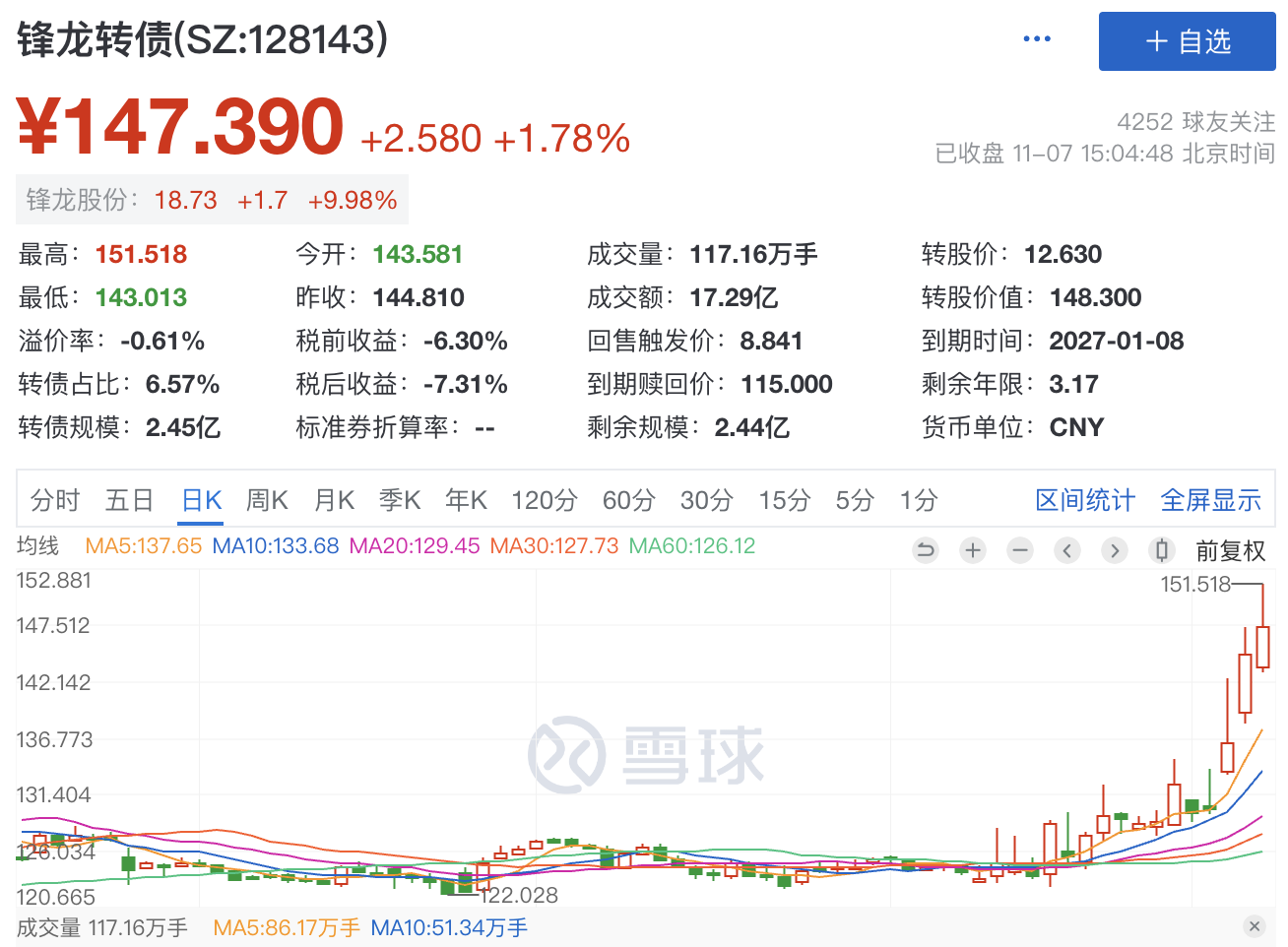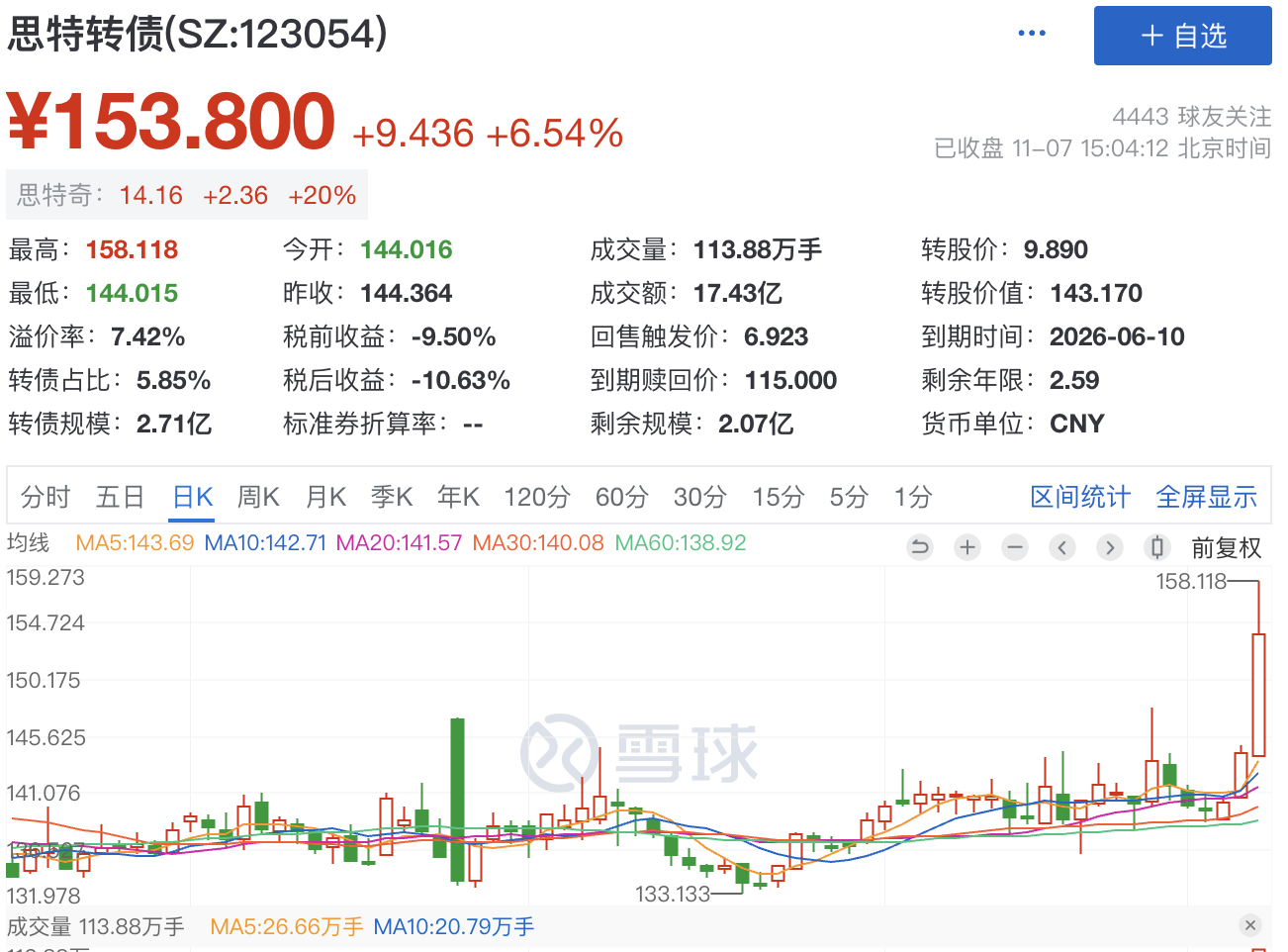 4)操作建议:如果中签,首日打算落袋为安,可以考虑设置一个回落条件单,基准价130元,回落0.5%,买三价卖出。再加一个时间条件单,14:57,自定义价格143元卖出(如果冲高能卖到高点,注意不要修改价格)。