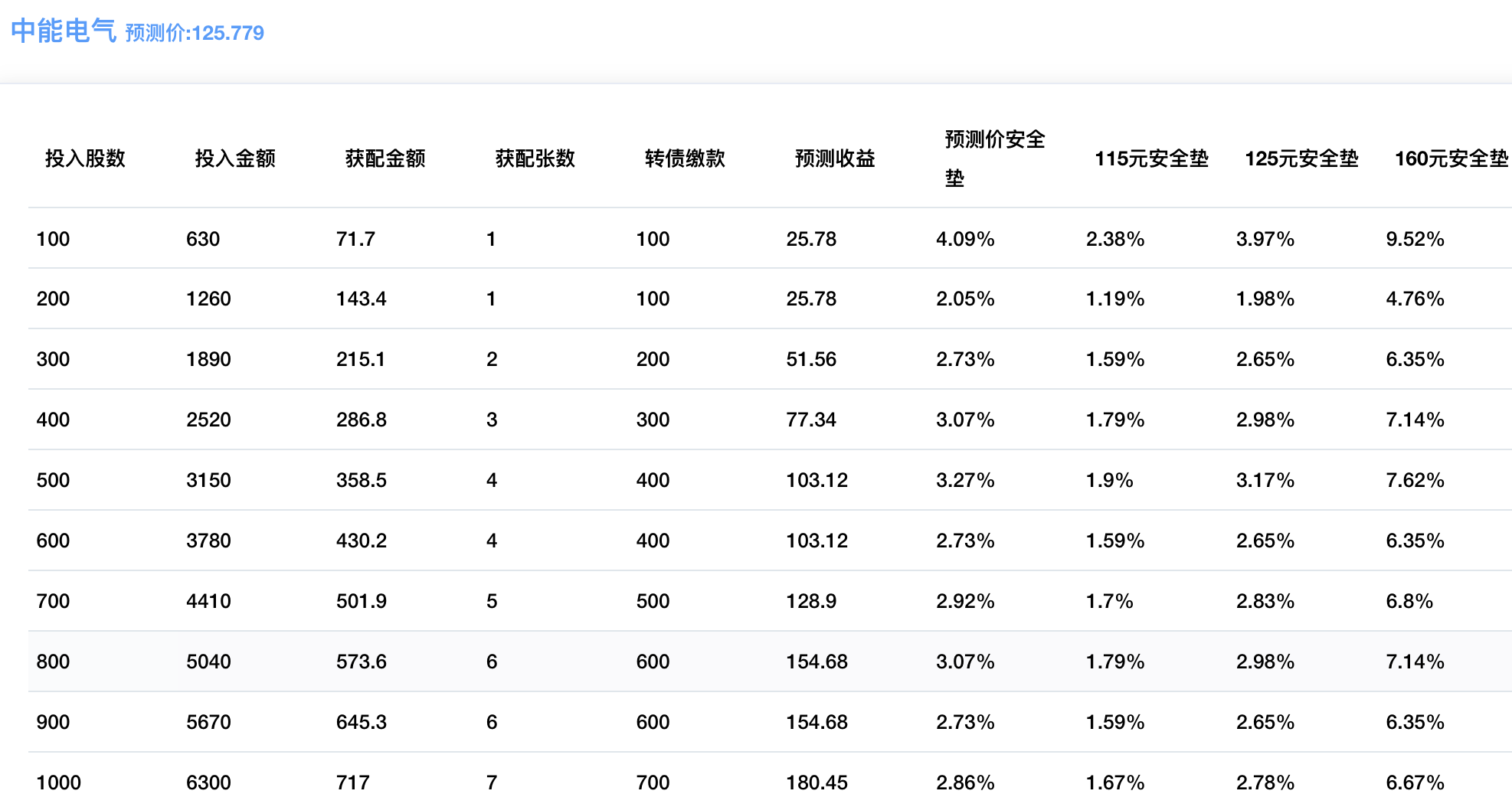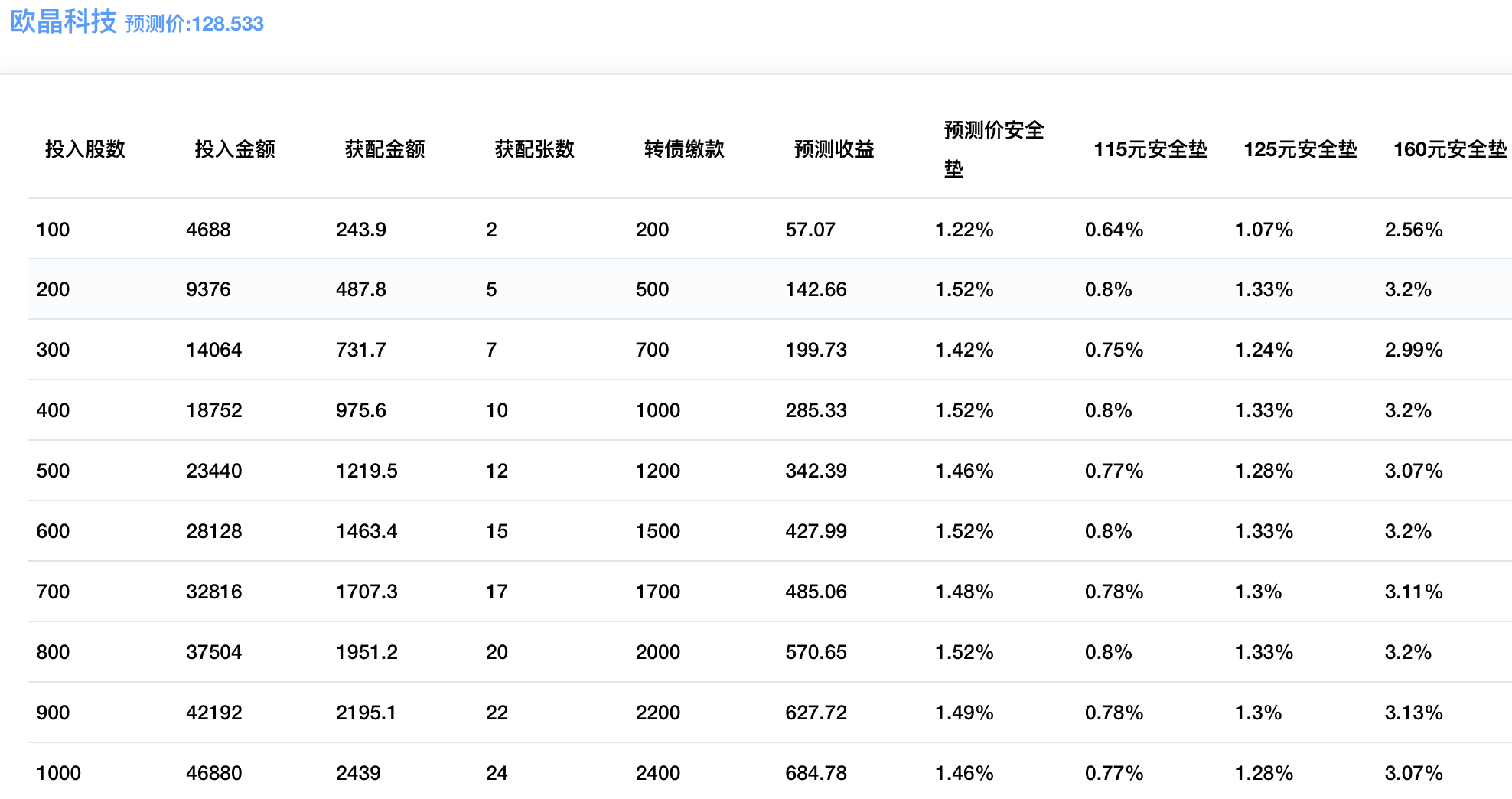 以当前转股价值,程序预测上市价在128元左右,由于流通规模较小,启四个人预测上市价可达160元左右,配债所需股数和安全垫可以参考下图,安全垫太低。