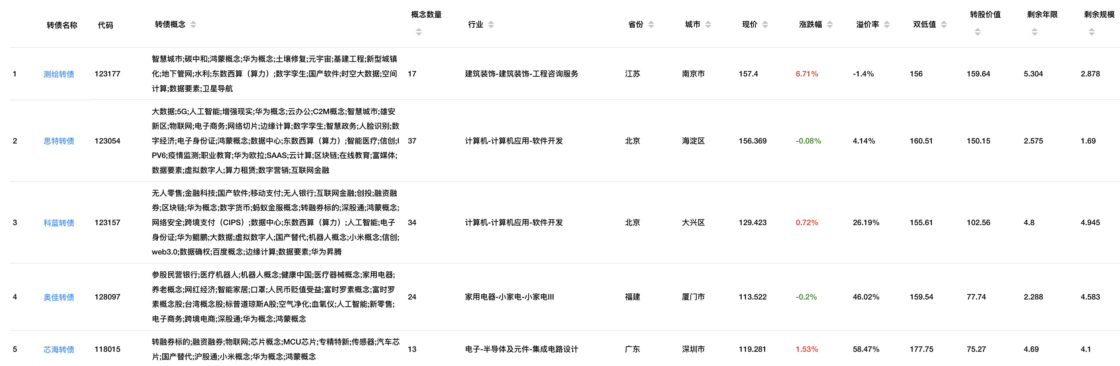 目前转债中和鸿蒙概念相关的有5只,分别是测绘转债、思特转债、科蓝转债、奥佳转债、芯海转债: