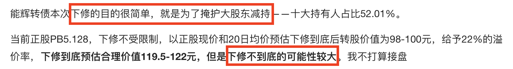 3)能辉转债,修正后转股价格:32.80元/股,修正后转股价值86.28元,果然如启四所料,未下修到底。